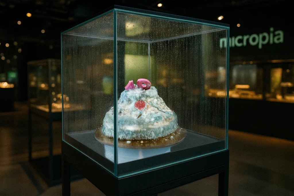 De taart is te bezichtigen in Micropia.